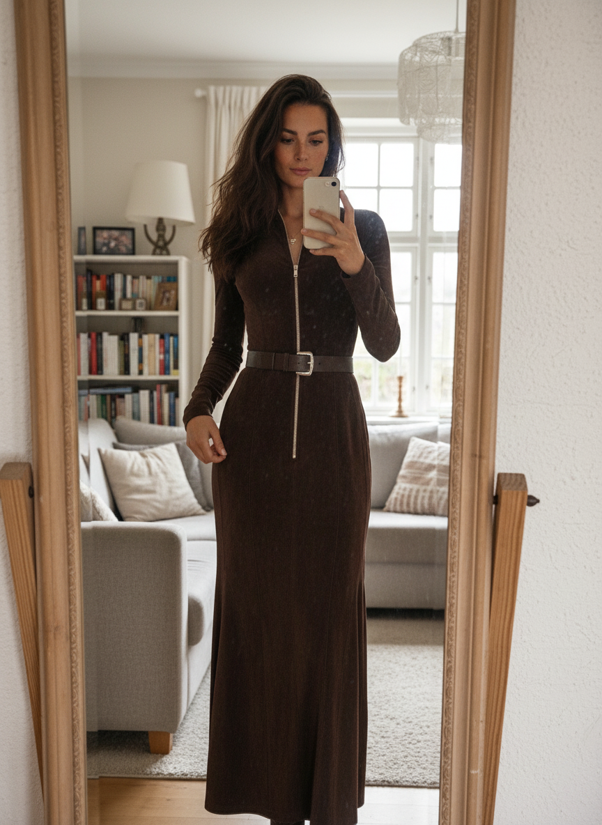 Utrolig smuk kjole! Stoffet falder perfekt, og lynlåsen foran giver et moderne twist. Perfekt både til hverdag og fest – jeg er helt forelsket!