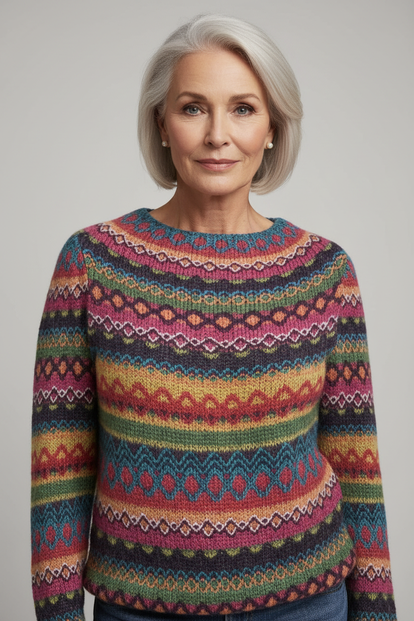 Liv-sweateren er fremstillet af en behagelig uldblanding, der er varm og åndbar. Halsudskæringen og skuldrene har et raffineret nordisk-inspireret mønster i beroligende vinterfarver, der tilføjer et klassisk sæsonpræg. Den afslappede pasform giver komfort og bevægelsesfrihed, mens de ribbede manchetter og forneden sikrer, at sweateren bevarer sin smukke form.