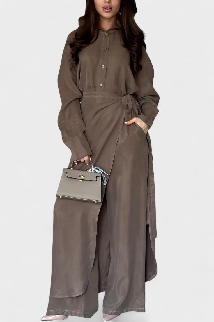 Ida | Langærmet sæt er en hyldest til håndværk og diskret prestige. Sætets løs skjorte og bukser i skørt-lignende snit giver bevægelsesfrihed og let elegance uden at begrænse silhuetten. Fremstillet med omtanke og materialer af høj kvalitet, afspejler Ida en tidsløs æstetik og varig værdi, der tiltaler samlere og bevidste købere. Den begrænsede tilgængelighed gør Ida til et eksklusivt element i garderoben, hvor hver detalje taler om kvalitet. Det bløde stof falder naturligt og følger bevægelser uden at tvinge; silhuetten forbliver slank uden elastik. Den neutrale palet giver Ida en tidløs appel og nem styling fra forår til efterår for både hverdags- og aftenslook. Sættet udtrykker en arv af omhyggelige snit og materialer, derbinder klassisk elegance med moderne komfort. Som bevis på langsigtet værdi er Ida designet til at holde sig relevant år efter år.