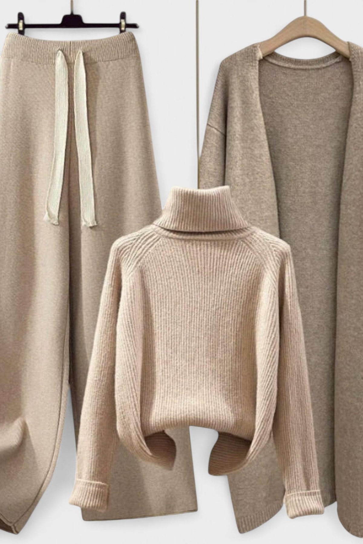 Johanne | Strikket sæt repræsenterer tidløs elegance gennem omhyggeligt håndværk og nøje udvalgte materialer. Sættet består af brede bukser med justerbar talje, en højhalset trøje og en lang jakke, designet til kølige dage, hvor substans møder stil. Det bløde, varme strikmateriale og den fejlfri pasform skaber et sofistikeret udtryk, der passer til hjemmet, arbejde eller udflugter. Samspillet mellem tradition og moderne elegance gør Johanne til en investering i garderoben med lang levetid og alsidighed.