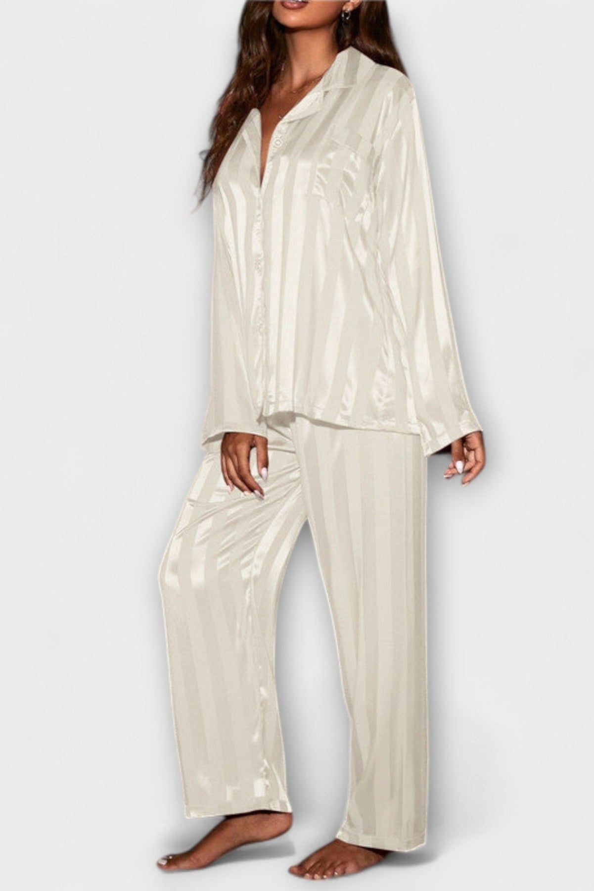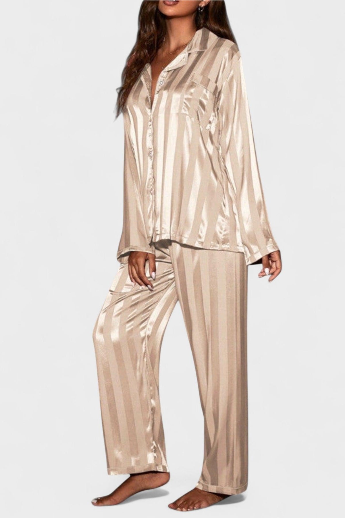 Laura | Langærmet sæt udgør en ædel fusion af tidløs elegance og fineste håndværk. Det lange satin-sæt præsenterer et klassisk snit, der ligger behageligt mod huden og giver et raffineret look, også når du hviler. Sættet formidler luksus uden at være prætentiøst og henvender sig til dem, der værdsætter kvalitet og omtanke i hver detalje. Produktion i begrænset antal understreger eksklusiviteten og giver sættet en diskret samlerværdi. Med satinfinish og nøje udvalgte materialer signalerer Laura en holdbar elegance, der passer til særlige aftener og tilføjer et strejf af luksus til enhver aften. Håndværk og omtanke i hver søm og finish.