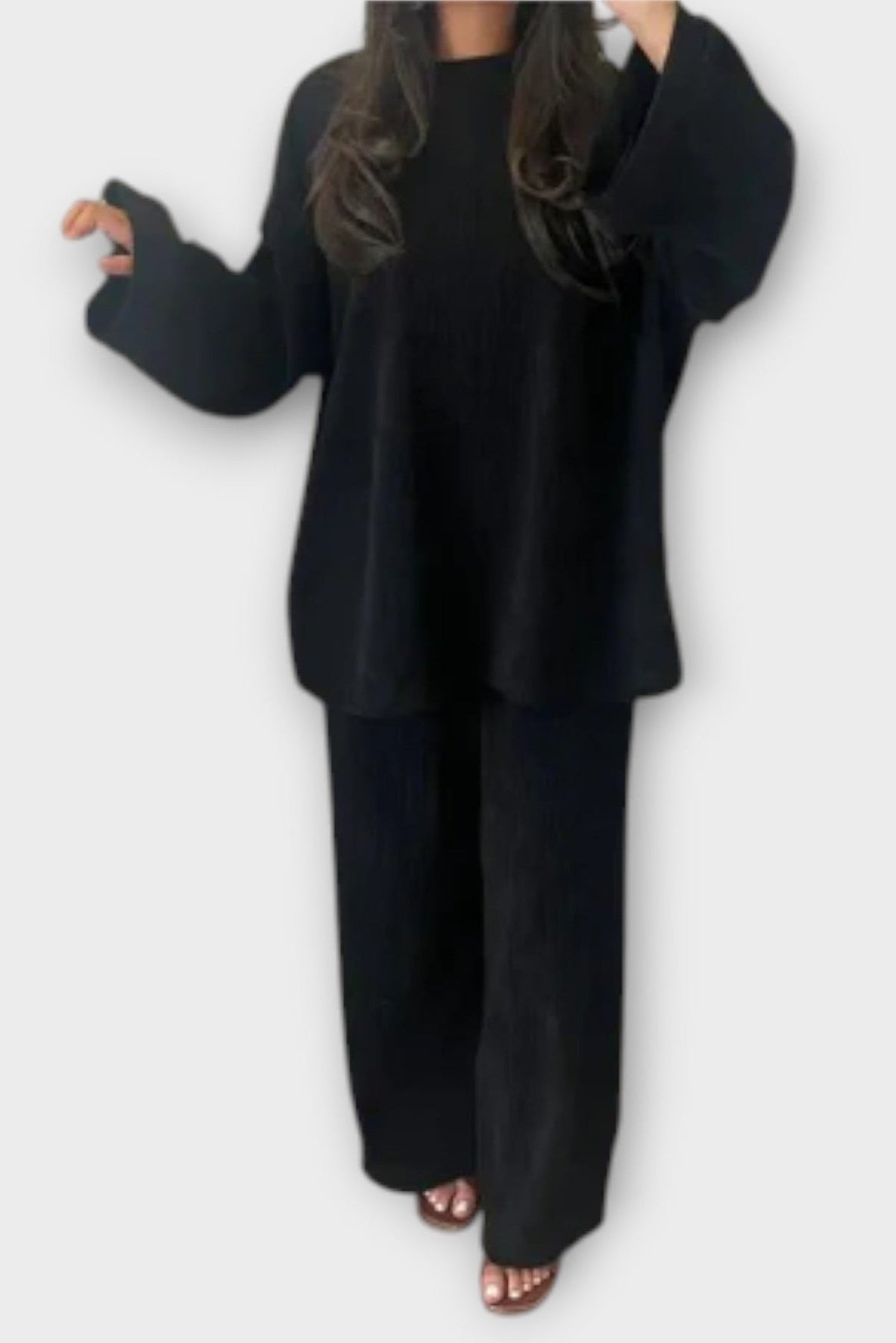 Trine | Langærmet sæt repræsenterer en sofistikeret fortolkning af afslappet elegance, hvor komfort møder nutidig finesse. Dette oversized-sæt giver en let, luftig silhuet og bevægelsesfrihed uden at gå på kompromis med stil. Den langærmede top og de lige bukser udstråler en moderne, afslappet flair, der passer til rejser, hjemmet og et urbant hverdagslook. Fremstillet af bløde, lette materialer, hvis konstruktion afspejler omhyggeligt håndværk og en dedikation til detaljer og lang levetid. Begrænset produktion giver Trine-sættet en tidløs værdi og en ægte samlerappel.