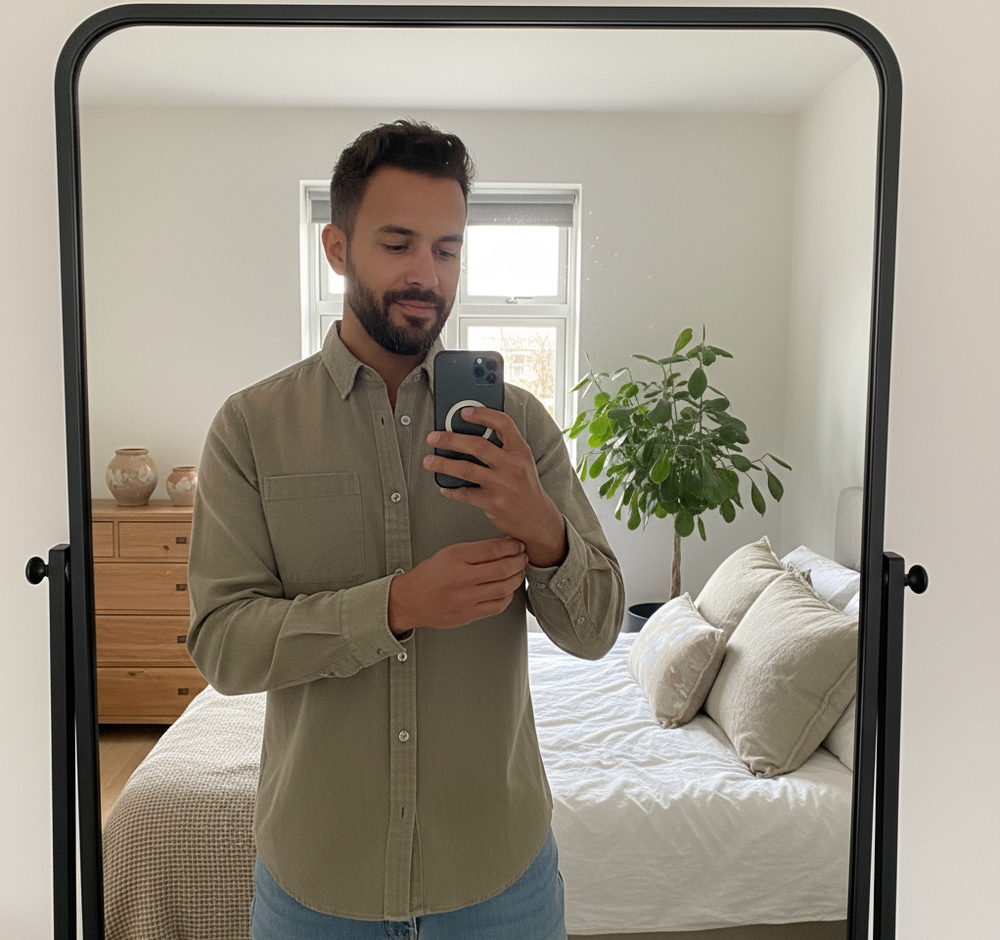 Jeg elsker den her skjorte. Materialet er robust men stadig blødt, og farven passer til næsten alt. Jeansene sidder perfekt og er super fleksible.