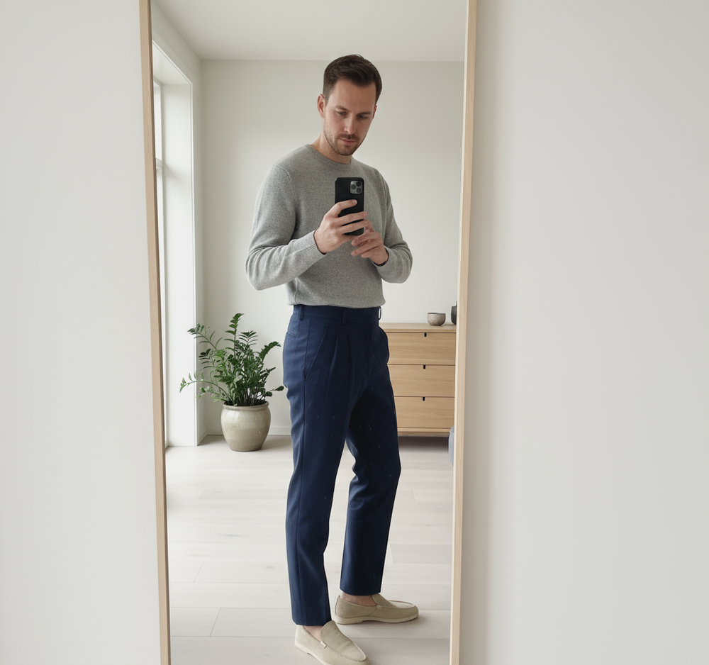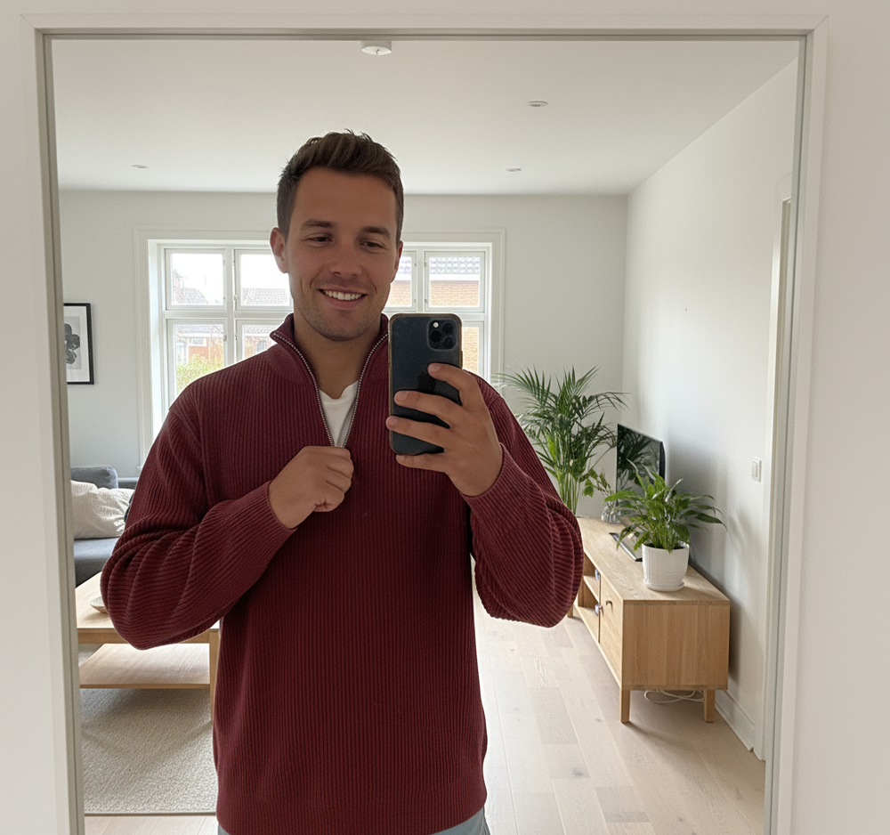 Kombinationen af strik og dress-bukser fungerer overraskende godt. Bukserne har et skræddersyet look uden at føles stive, og sweateren er let men varm. Meget tilfreds!