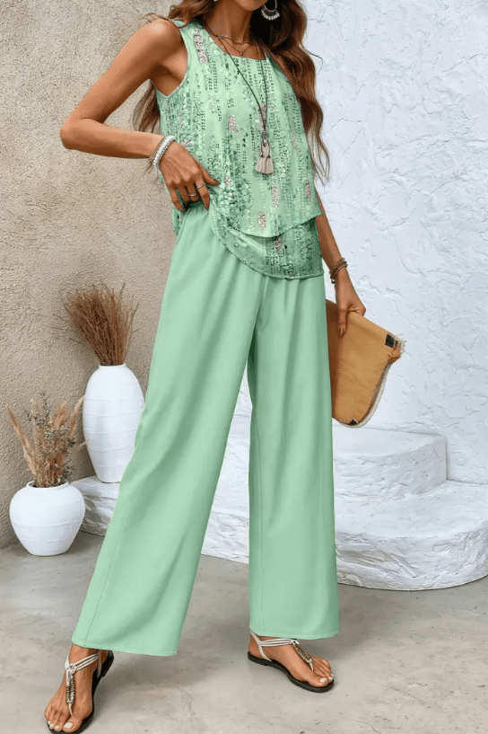 - Bevægelighed og styling: Den lette, luftige konstruktion giver bevægelsesfrihed og gør Lærke | Menthol Sæt alsidigt til brunch, havefester og elegante aftener.