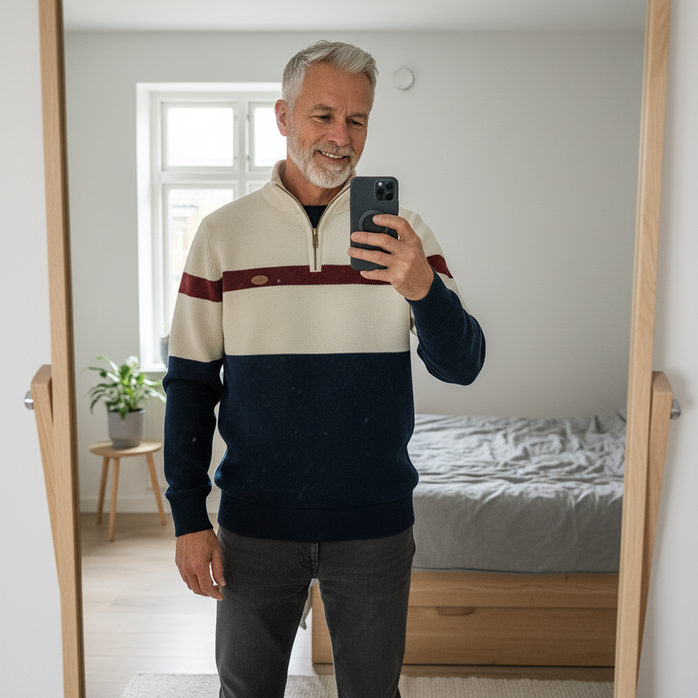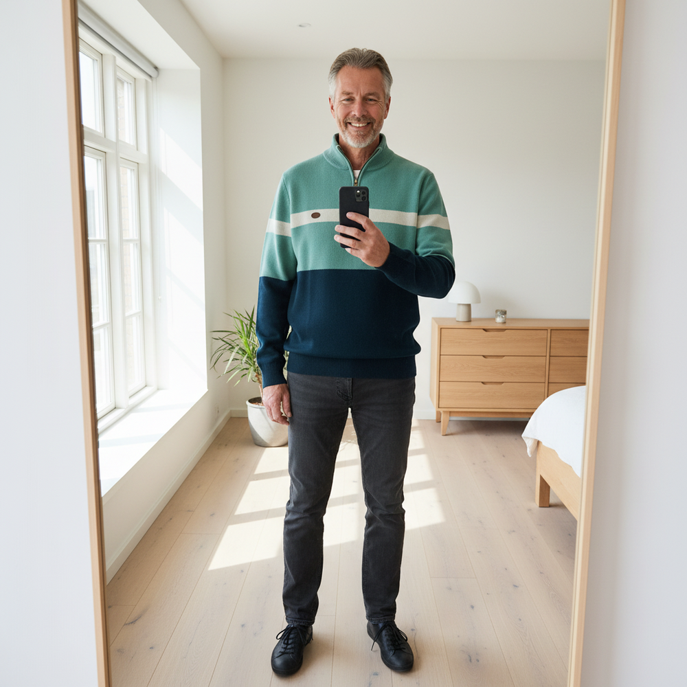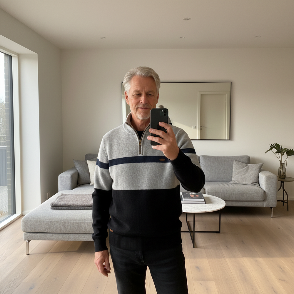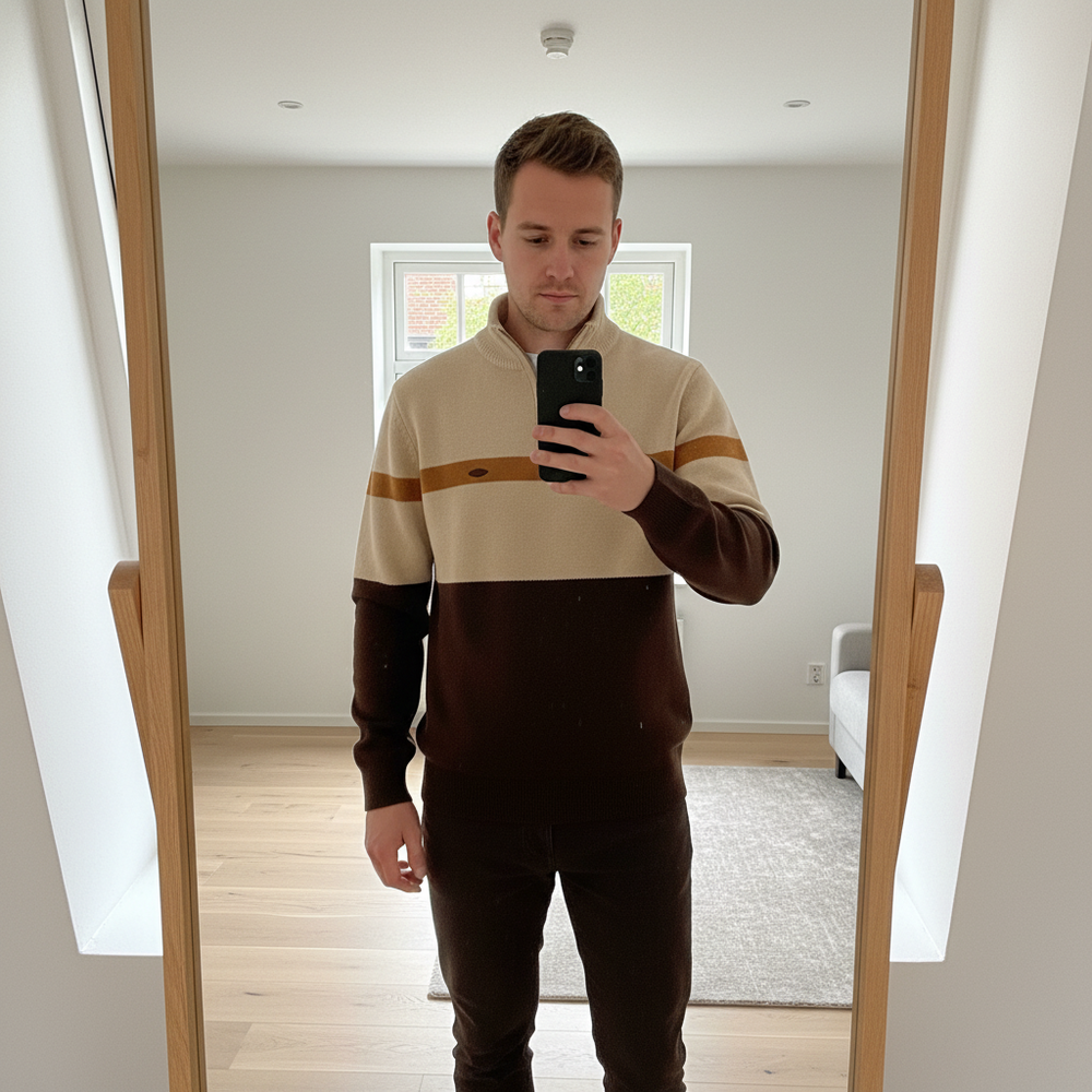Andersen – Nordisk trøje med lynlås er designet til mænd, der sætter pris på både kvalitet og karakter. Den bløde, strukturerede strik kombinerer moderne farveblokke med et tidløst udtryk, der passer lige godt på kontoret, i byen eller til weekenden. Med sin behagelige pasform, varme tekstur og elegante kvart-lynlås giver den dig et afslappet, men gennemført look – præcis som mange danske mænd foretrækker det.