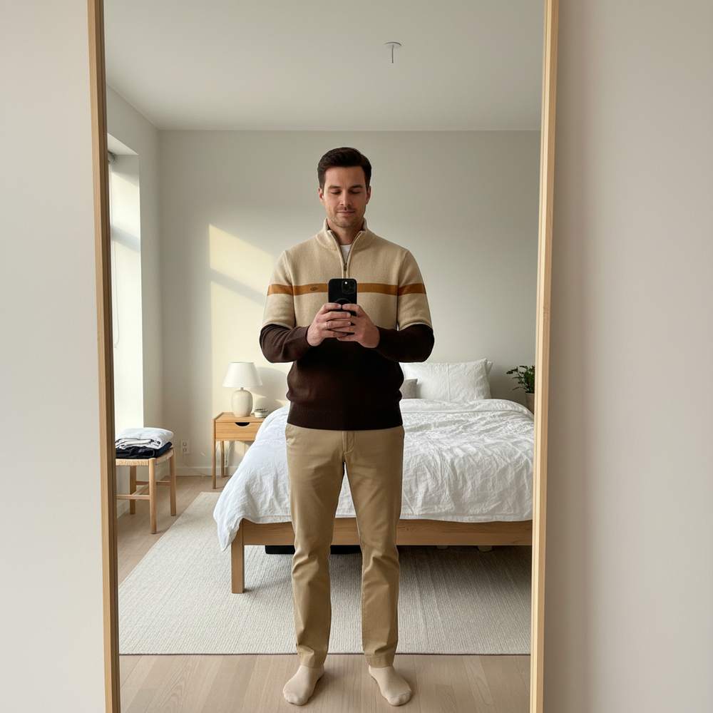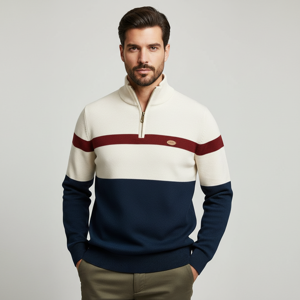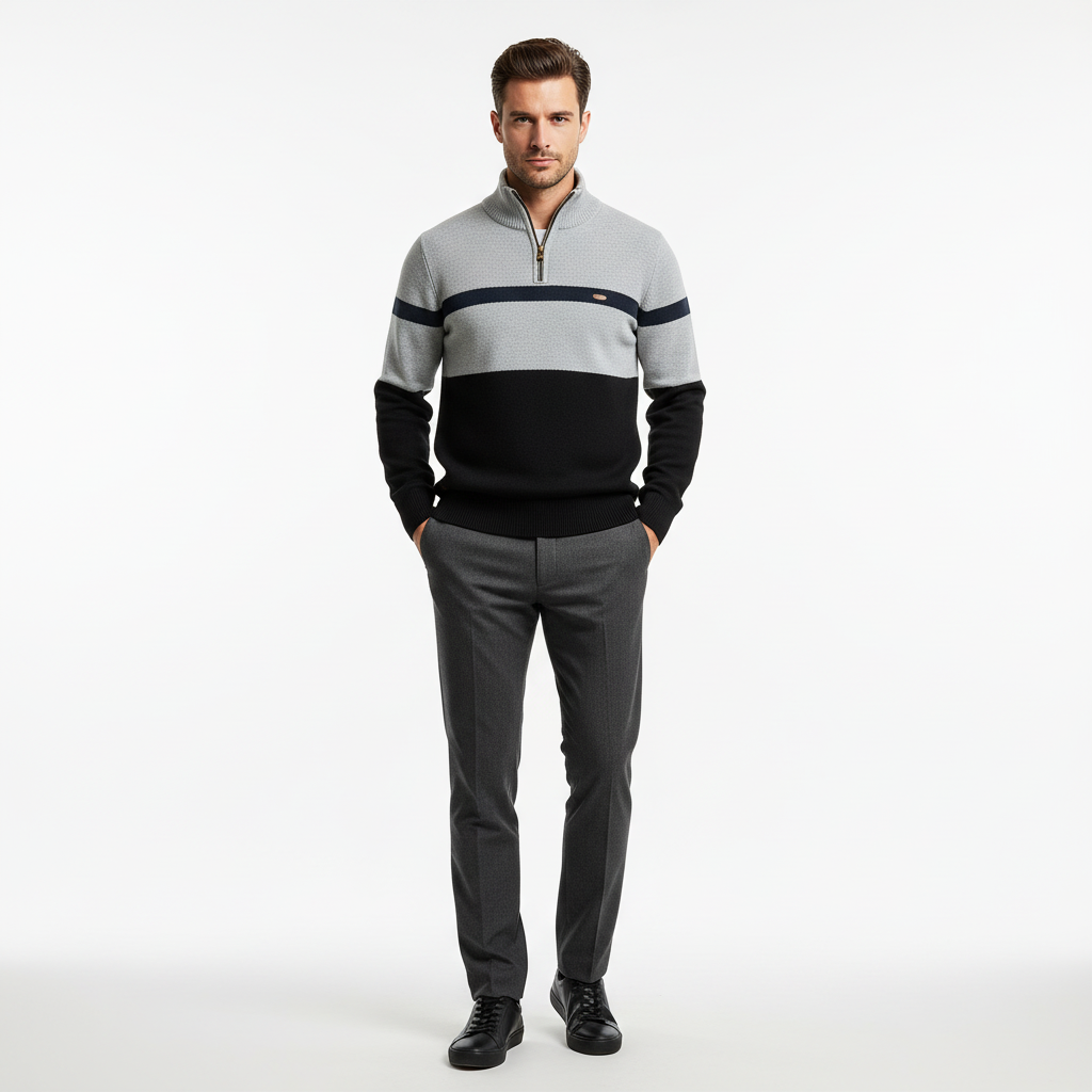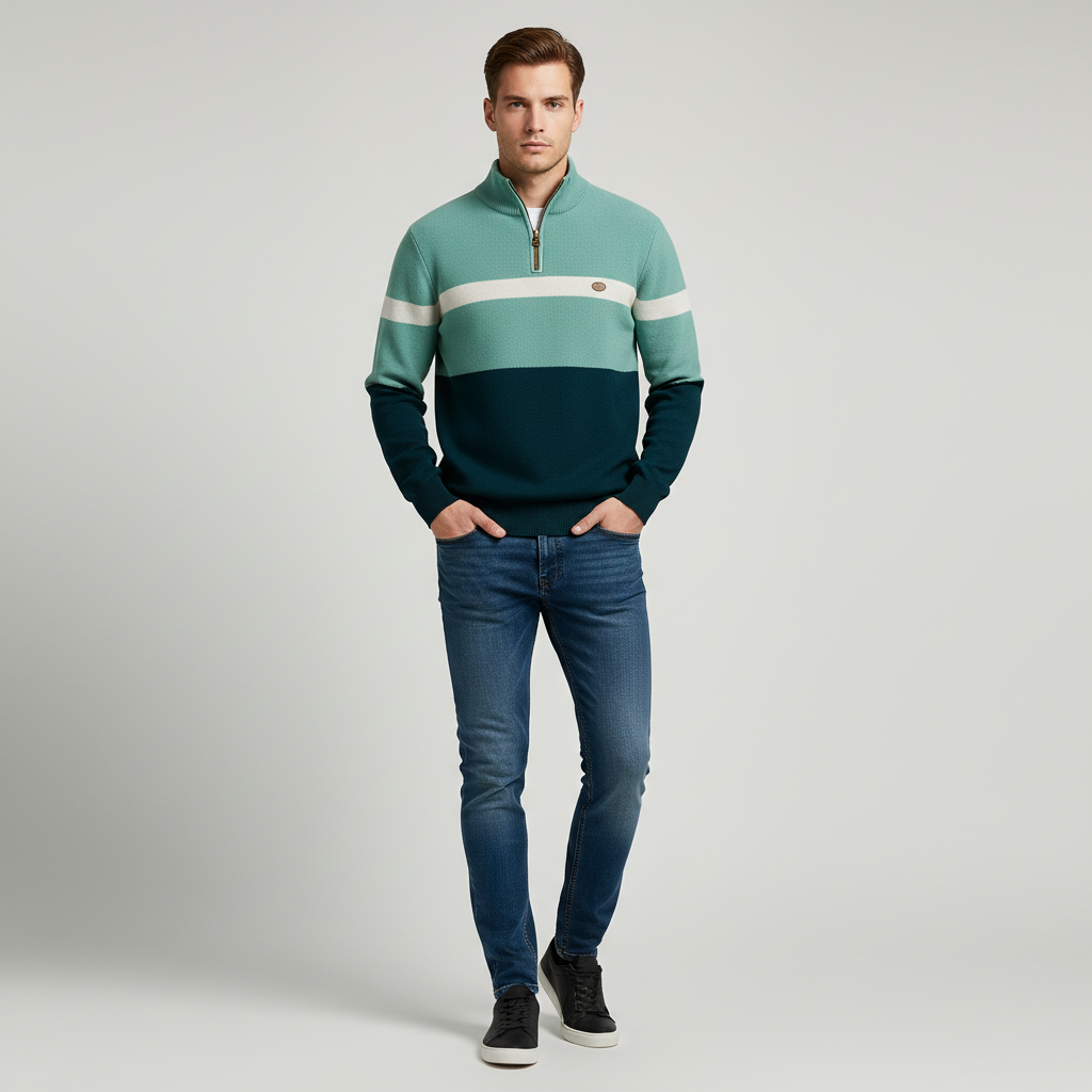 Andersen – Nordisk trøje med lynlås er designet til mænd, der sætter pris på både kvalitet og karakter. Den bløde, strukturerede strik kombinerer moderne farveblokke med et tidløst udtryk, der passer lige godt på kontoret, i byen eller til weekenden. Med sin behagelige pasform, varme tekstur og elegante kvart-lynlås giver den dig et afslappet, men gennemført look – præcis som mange danske mænd foretrækker det.